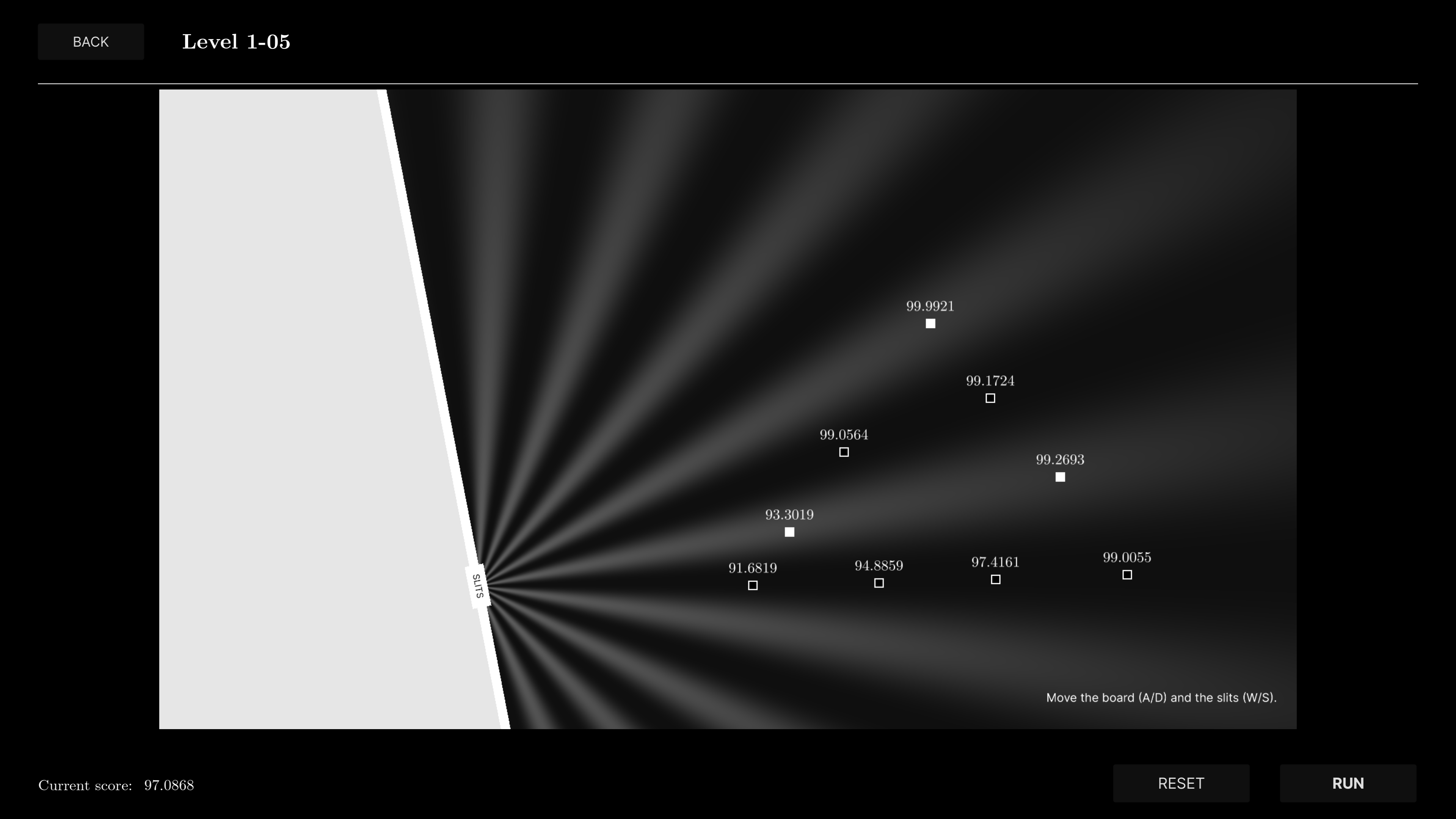 Wave Function is a puzzle game about quantum physics. You will do the double-slit experiment and adjust parameters; the interference stripes you produce will determine your score. You must satisfy brightness sensors with peaks and darkness sensors with valleys.